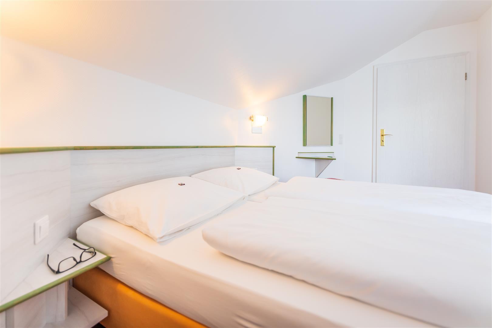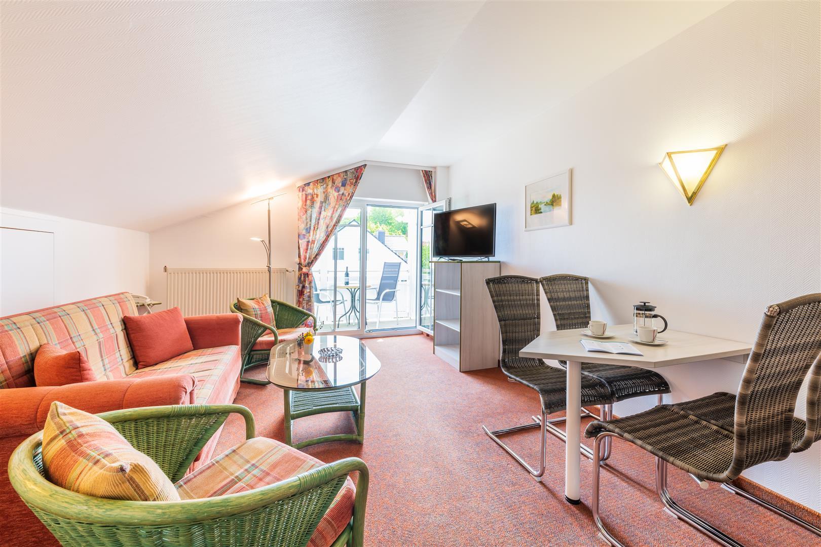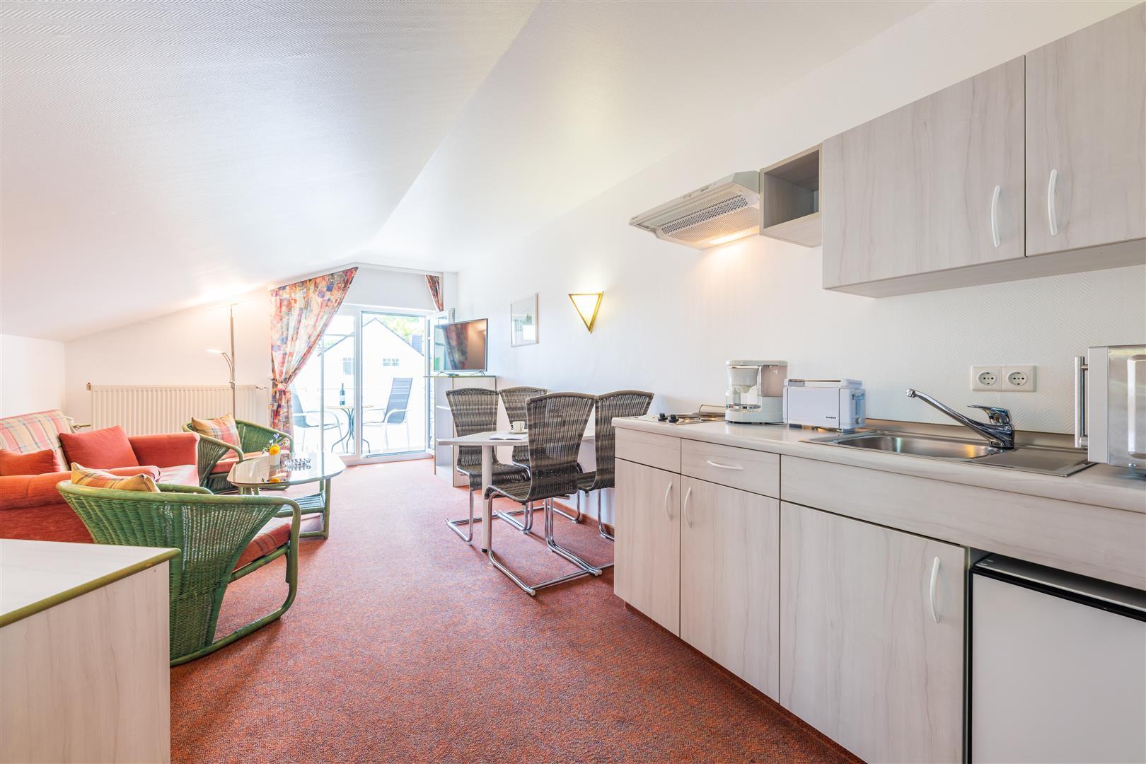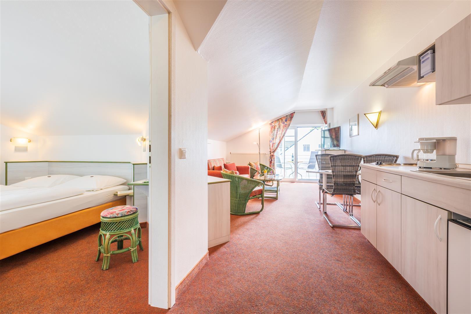 Unsere gemütlichen Appartements (ca. 40 qm) besitzen 1 Wohn- /Schlafraum, 1 separates Schlafzimmer mit Doppelbett, 2 Balkone, LCD Flat-TV, Telefon, Pantryküche.